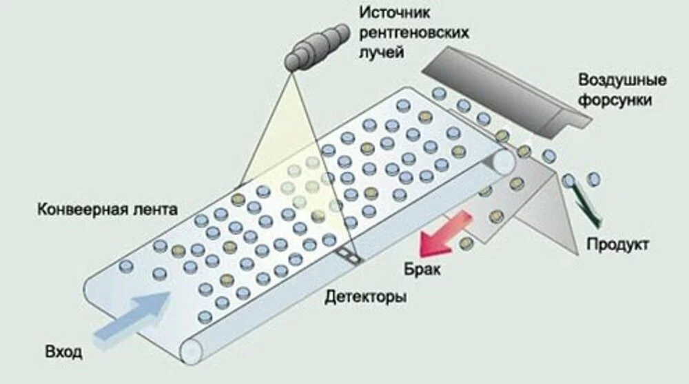 Продукт проходить горизонтальною конвеєрною стрічкою між джерелом рентгенівського випромінювання та їх приймачем. Рентгенівські промені поглинаються продуктом та сторонніми матеріалами. Рівень поглинання вищий для щільніших або потовщених об'єктів. Приймальна система вимірює інтенсивність рентгенівського випромінювання після поглинання продуктом, умовно визначаючи рівень яскравості між 0 (випромінювання відсутня) і максимальним значенням (рентгенівське випромінювання приймається по максимуму). Це дозволяє формувати 2D зображення продукту, яке потім аналізує систему обробки зображень.
