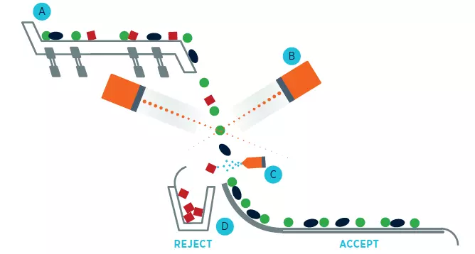 Які продукти сортує: овочі, фрукти, ягоди.