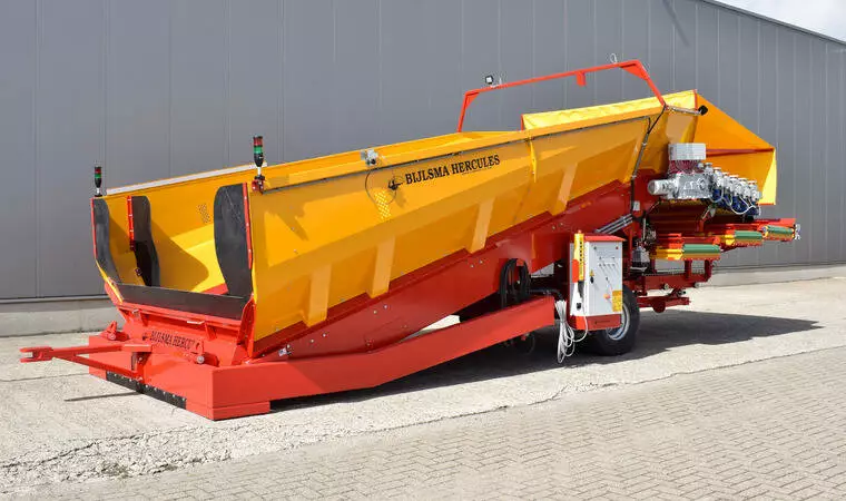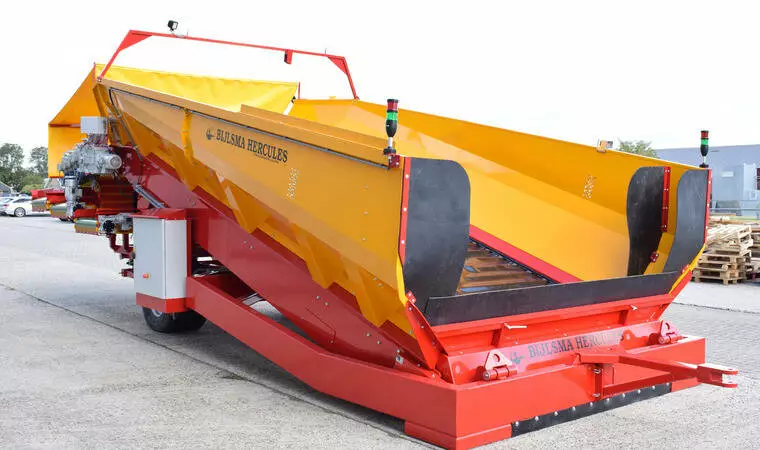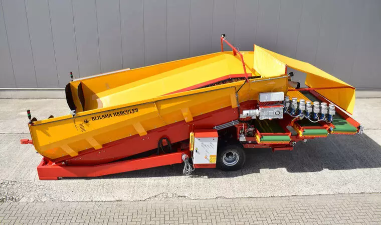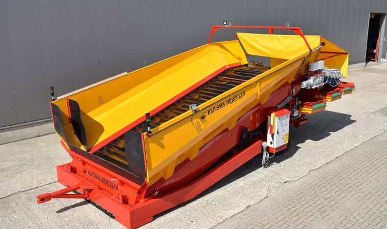Конструкція, що згинається, на розвантажувальній стороні розвантажувальної підлоги забезпечує оптимальний перехід між бункером і очищувачем продукту з мынымальни перепадом висоти. Донний транспортер складається з двох посилених роликових ланцюгів із встановленими між ними поперечними планками. Завдяки тому, що тканина з поліестеру та нейлону закріплена на планках із надлишком довжини, на донному транспортеры утворюються "кишені" що запобігають відкочуванню продукту. Розвантажувальний транспортер приводиться в дію електродвигуном, встановленим безпосередньо на редукторі. Це призводить до кращої передачі потужності. Швидкість розвантажувальної підлоги плавно регулюється. За бажанням система може бути розширена за рахунок автоматичного регулювання продуктивності. Цей блок управління підключений до перетворювача частоти і складається з датчика ультразвукового вимірювання товщини шару продукту на стрічці і ПЛК.